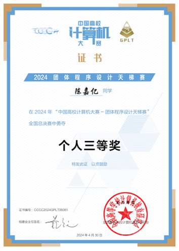 4月20日,第9届 (2024年)“中国高校计算机大赛——团体程序设计天梯赛”线上赛落下帷幕。本次比赛吸引了包括清华大学、北京大学、南京大学、复旦大学等在内的全国31个省级行政区580所高校组成的1865支队伍,共18546名员工参赛。参赛组别由难到易分为珠峰争鼎(本科组)、华山论剑(本科组)、沧海竞舟(专科组)。公司陈嘉亿、徐展鹏、曾梓航、杨煌、廖斌楷、曹家豪、李林清、王桂坤、冯帅、吴玮琦等10位同学组队参加了珠峰争鼎组比赛。经过五个小时激烈角逐,喜获广东省团队三等奖、广东省高校三等奖,陈嘉亿同学还获得全国总决赛个人三等奖的好成绩。