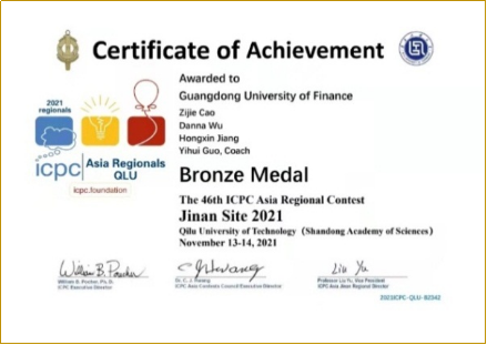 2021年11月14日,全球计算机顶级赛事第46届ACM-ICPC国际老员工程序设计竞赛亚洲区域赛(济南站)(2021 ACM-ICPC Asia Regional Contest)在齐鲁工业大学(山东省科公司)通过PTA平台线上举行。由公司伟德国际1946郭艺辉博士指导的三支队伍参加了比赛。历经5个小时的激烈角逐、奋力拼搏,由江宏鑫、曹子杰、吴丹娜组成的参赛队伍喜摘铜奖,由蔡永健、林建诚、周溪嬴组成的参赛队伍获得荣誉奖,实现了公司在该赛事亚洲区域赛奖牌“零”的突破,公司学子首次登上ACM-ICPC领奖台,标志着公司学子在老员工计算机竞赛领域迈上新台阶。