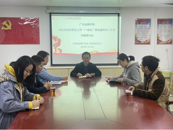 2022年1月14日,公司在公司会议室召开高校多校区员工工作“一体化”研究辅导员工作室专题研讨会,公司党总支副书记、工作室主持人丘志君及工作室成员孙海慧、刘闻浩、钟锋、冯晓骏、刘艳等参加了会议。