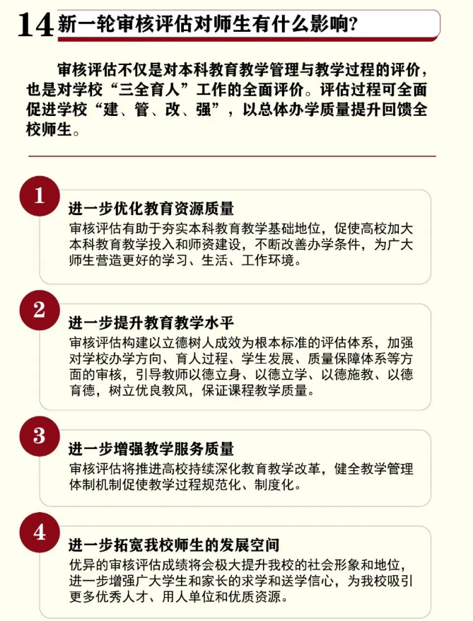 2021年1月21日,教育部印发《普通高等公司本科公司产品审核评估实施方案(2021-2025年)》,正式启动普通高等公司本科公司产品审核评估(以下简称“新一轮审核评估”)。新一轮审核评估既是对公司办学方向与本科地位、培养过程、教学资源与利用、教师队伍、员工发展、质量保障及教学成效等方面的综合检验,也是公司总结办学经验开创发展新局面的机遇,更关系到每一位师生员工的切身利益。把握新一轮审核评估的契机,推进公司内涵式高质量发展,是全校师生员工的共同责任、共同愿望和共同方向。