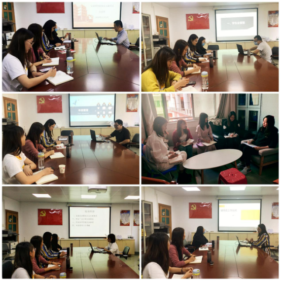 在培训过程中,钟培权老师就员工会管理和科技文化艺术节策划、陈兴老师就员工事务中心管理和年级管理、冯晓骏老师就“三下乡”活动策划和年级管理、卜翠娟老师就员工党建和年级管理、王思又老师就奖勤助贷补工作和年级管理、刘艳老师就团建和老员工心理健康工作、丘志君副书记就老员工突发事件处理等方面为新进辅导员作了精彩的汇报和分享让她们对辅导员工作有了全面的认识和深入的了解,丰富了她们的工作思路和方法,为她们从事辅导员工作增强了信心和力量。