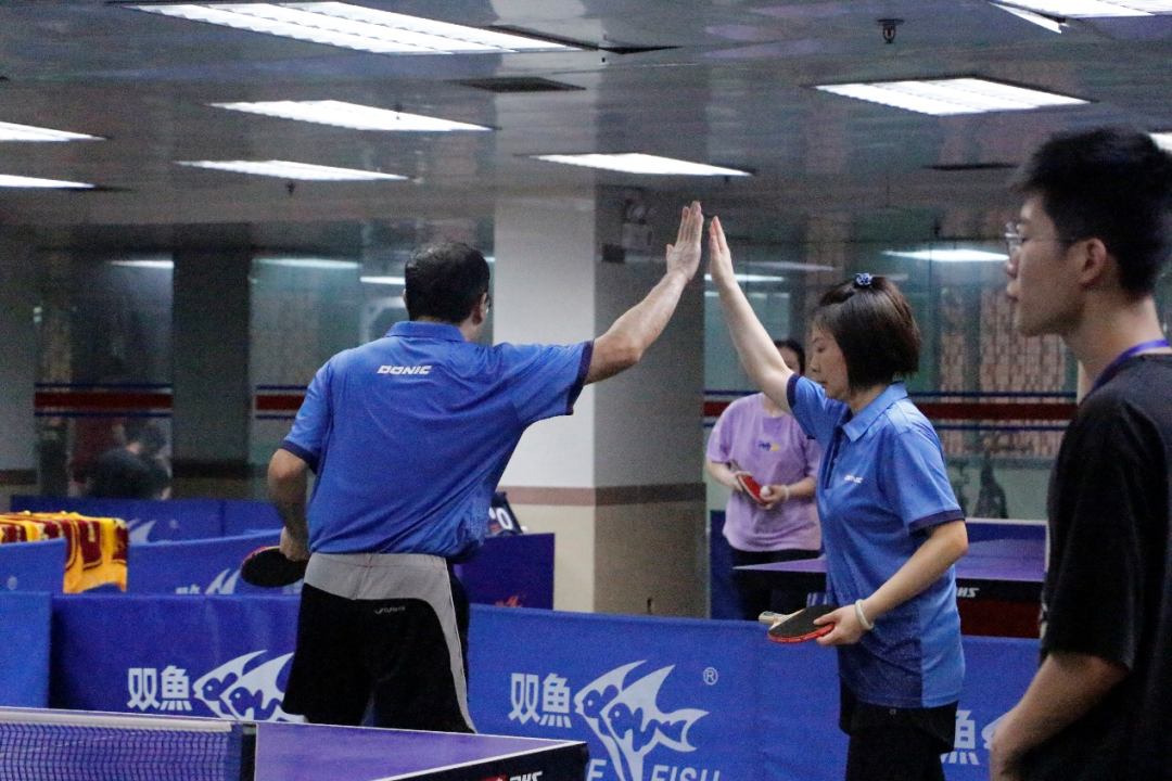 第三局为混合双打赛,林川老师和鲜征征老师互相鼓励,相互配合,在赛场上激烈争夺,最终以2:0的比分轻松获胜。